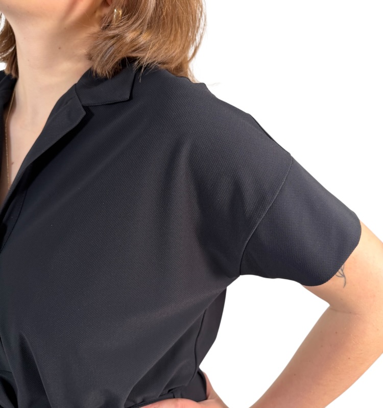 + offener Reverskragen mit tiefer V-Öffnung und kleiner Zierknopfleiste